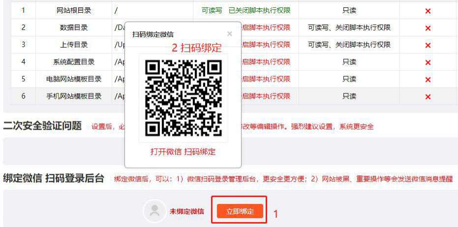 依次點(diǎn)擊【設(shè)置】-【安全設(shè)置】找到綁定微信 掃碼登錄后臺(tái),然后點(diǎn)擊【立即綁定】按鈕,彈出二維碼,用微信掃碼即可綁定