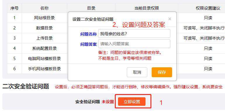 最后總結(jié)一下,不是每一個(gè)安全設(shè)置都必須使用,只有二次安全驗(yàn)證問題和目錄權(quán)限這這2項(xiàng)才是必須的,請(qǐng)務(wù)必正確設(shè)置,如果未正確設(shè)置,每次登錄后臺(tái)都會(huì)彈框提醒。